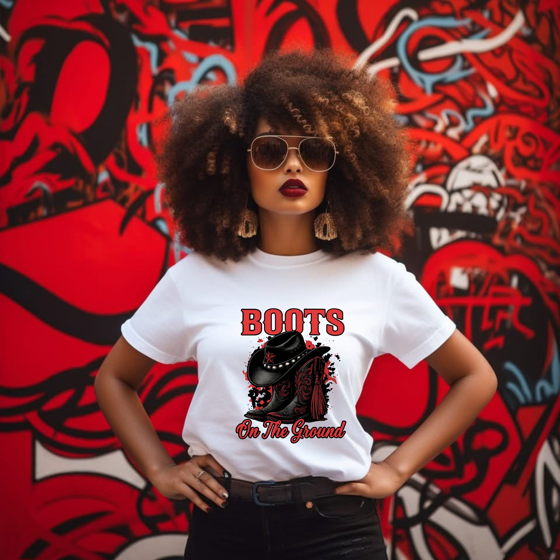 Step into bold country style with this “Boots on the Ground” digital design perfect for cowgirls, rodeo lovers, and Western fashion fans! Featuring detailed cowboy boots, a classic hat, and rustic textures in striking black, red, and white tones, this high-resolution PNG adds attitude and charm to any creative project.